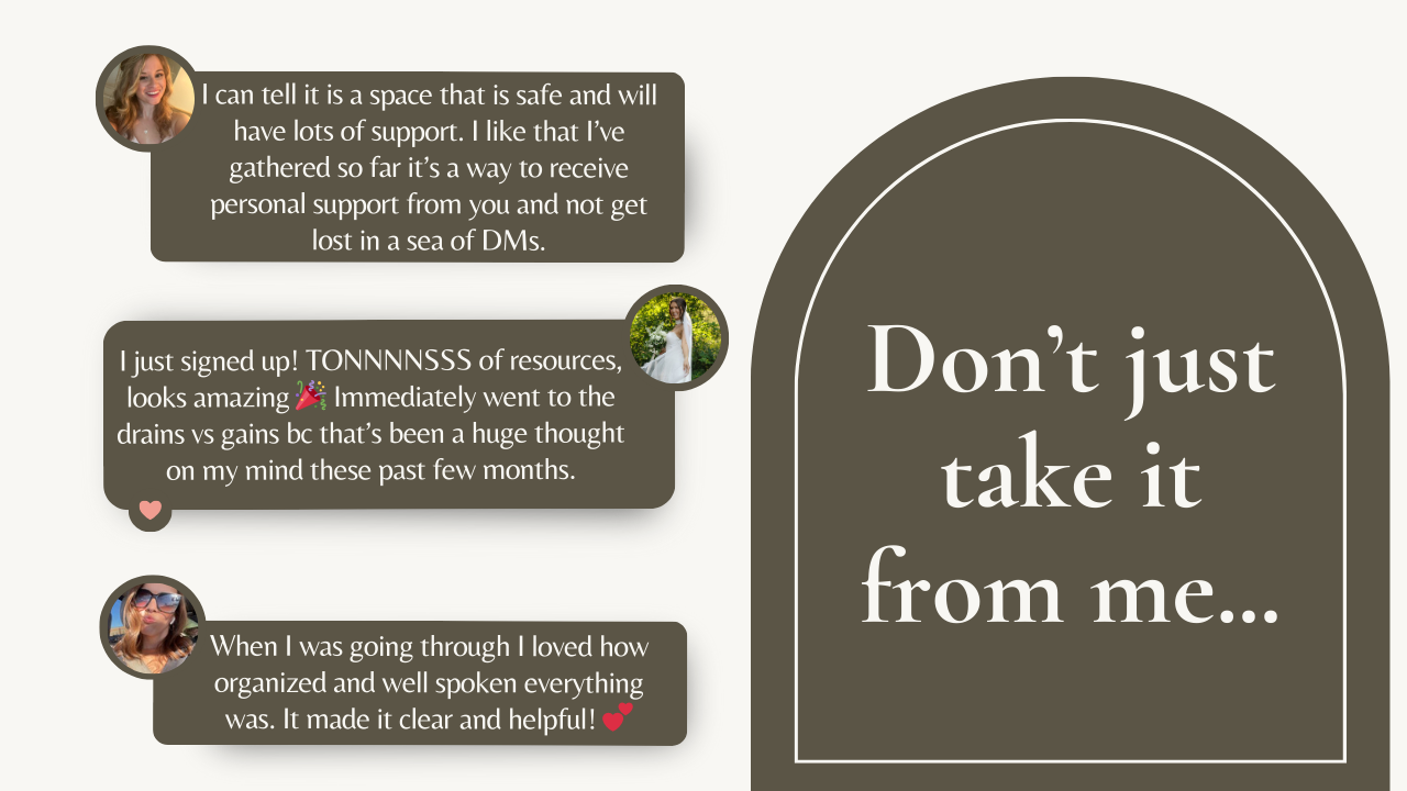 A community of women who get it, real-time guidance from me, and the option for deeper support through private 1:1 coaching.